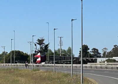 Según testigos, el conductor intentaba ingresar al predio logístico en marcha atrás, una práctica que se repite con frecuencia en este tipo de instalaciones y que representa un riesgo tanto para los transportistas como para el resto de los usuarios de la vía. Durante la maniobra, el camión perdió estabilidad y la carga terminó volcada sobre el pavimento.